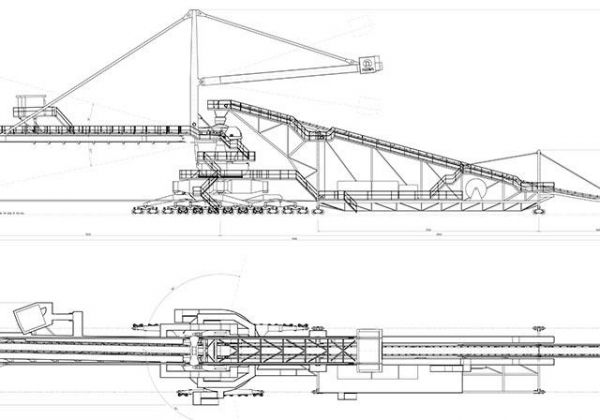 Kombinovaný skládkový stroj SCR 05/05-35 slouží k zakládání lignitu na skládku i jeho opětovnému nakládání na pasovou dopravu.