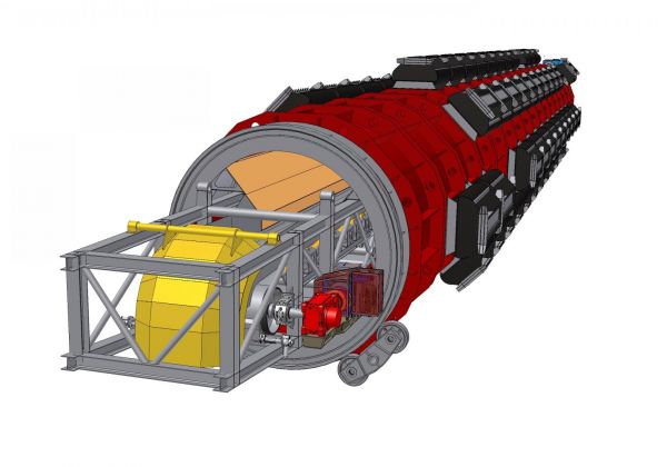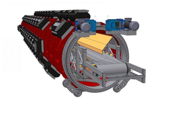 Pracovní buben je navržen jako jednoplášťová konstrukce svařená z jednotlivých válcových sekcí, které po svaření vytvoří tzv. pracovní část bubnu, na které budou přišroubovány oboustranné korečky. Jednotlivé sekce bubnu jsou před svařením na obou čelech opracovány, čímž je zaručena paralelnost jednotlivých stykových/svarových ploch a výsledný válcový tvar bubnu po celé délce. Na obou koncích bubnu jsou přišroubovány kuželové díly, na které budou následně připevněny pojezdové dráhy a cévový věnec otoče bubnu. Vnitřní protor bubnu je obložen otěrovými deskami.