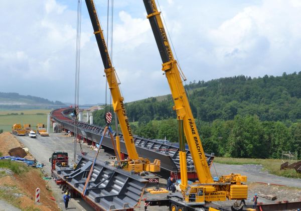 | Note: | Total length of the bridge: 625 m, arch radius: 1500 m, elevation: 26 m, maximum height above ground: 49 m, number of section: 2x 49,5 m and 8x 65,7 m, weight of the heaviest part: 98 tons. Total weight of steel structure: 3375 tons |