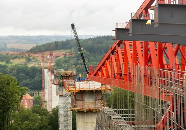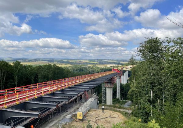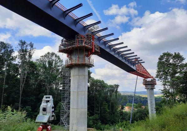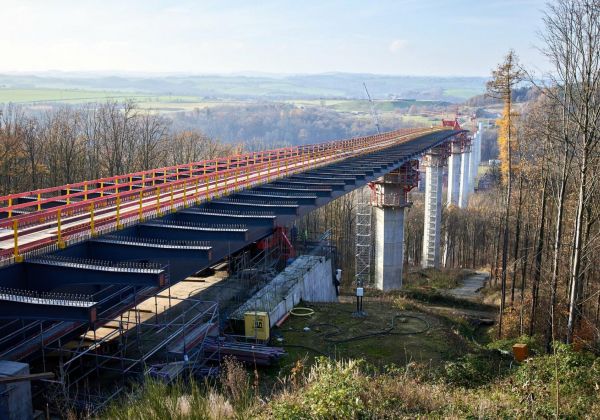 Ocelová konstrukce silničního mostu. OK je navržena jako spojitý komorový nosník o 9 polích spřažený železobetonovou deskou. OK je v podélném směru dělena na 44 segmentů, které jsou postupně k sobě svařovany příčnými svary, každý segment se skládá ze 4 „L“ dílců, které tvoří podélné svary. Most má 8 pilířů, celkovou délka OK 916m, šířka 15,3m. Montáž OK mostu probíhá systémem postupným výsunem (9 taktů) pomocí ocelových lan, od jedné opěry postupně ke druhé. Firma Hutní montáže provádí pouze montáž.