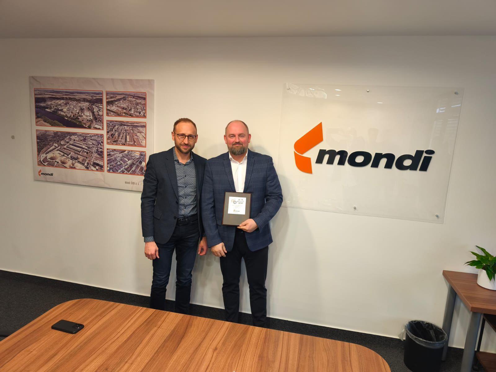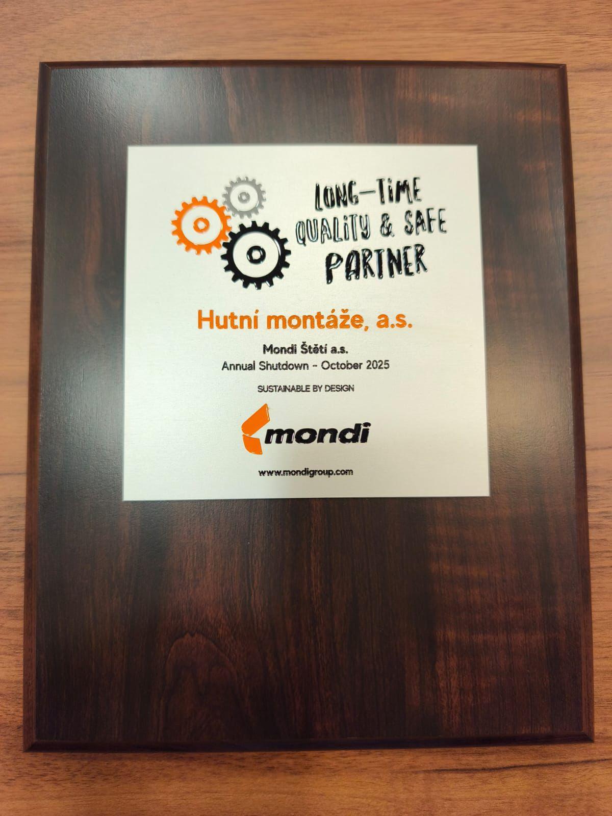 Dne 2. 12. 2025 jsme převzali ocenění Long Time Quality & Safe Partner, předané generálním ředitelem společnosti Mondi Štětí a.s., panem Miroslavem Zítkou.